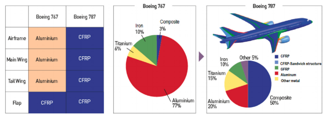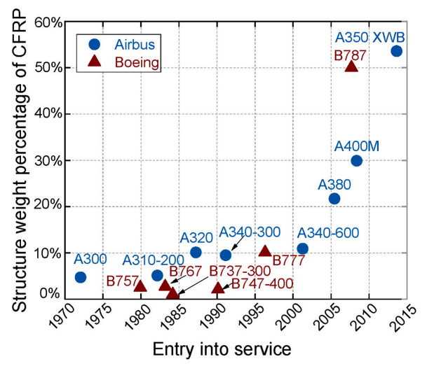 波音公司于2003年启动了787项目,在机身和主要结构中比以前的任何商用飞机都更大量地使用CFRP(50wt%)。图2显示了波音767和波音787所用材料的比较。CFRP的使用量从仅在波音767的襟翼中使用3wt%大幅增加到覆盖机身、主翼、尾翼和襟翼的50wt%。波音787。由于CFRP的广泛采用,铝的百分比从 77wt%下降到20wt%。与波音767相比,波音787的重量大幅减轻,节省了20-22%的燃油。2005年,波音787的竞争对手空中客车公司推出了A350 XWB计划,该计划也主要使用CFRP(53wt%),从而减少了50%结构维护和机身检查频率降低(空客A380要求的间隔时间从8年延长到12年)。
