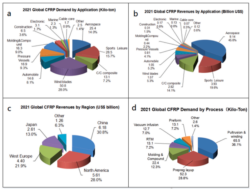 2021年,中国市场(61.8亿美元)取代美国市场成为最大的CFRP市场份额,占全球消费量的30.8%(图5c)。这一趋势反映了COVID-19大流行对美国航空航天市场的重大影响。中国生产了全球90%的CFRP运动休闲产品和全球60%的风电叶片,在全球CFRP收入中占据重要地位。欧洲消费了44亿美元的CFRP复合材料,占全球收入的21.9%。全球对CFRP按工艺的需求如图5d所示,其中纤维缠绕和拉挤工艺超过预浸料和叠层工艺,成为2021年的主要制造方法。2021年全球对纤维缠绕和拉挤工艺制造的CFRP的需求量份额最大为65.5kt,占总需求的36.1%。这一令人印象深刻的转变部分受到航空航天大流行回归的影响,但即使航空航天行业能够在2019年恢复到原来的规模,来自风能和压力容器制造的强劲驱动力将继续在创新和成本效益方面发挥重要作用CFRP复合材料。值得注意的是,长丝缠绕和拉挤工艺从纤维到最终复合材料产品的材料浪费最少。